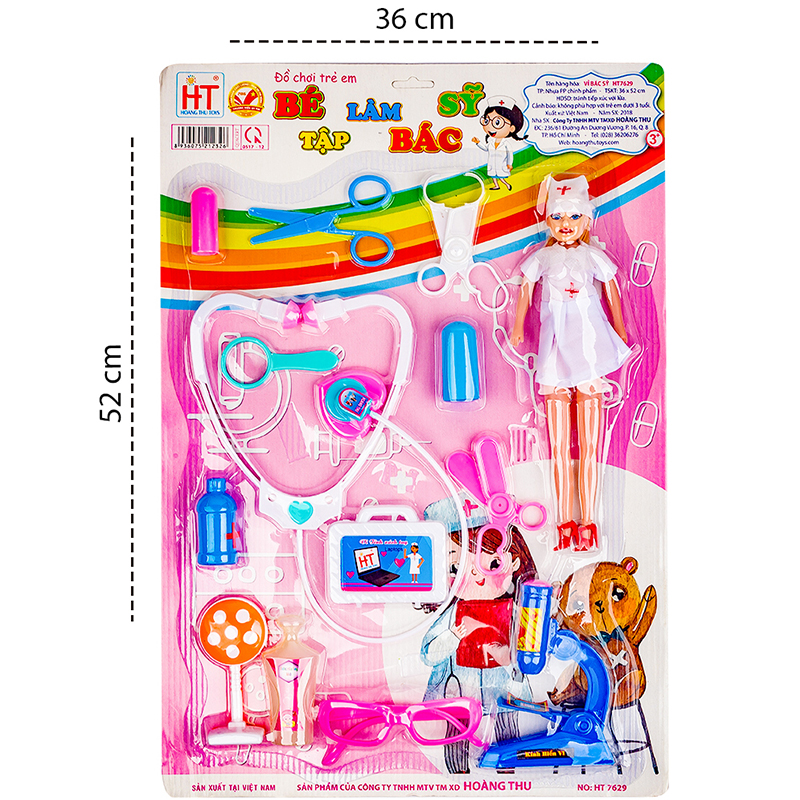 Đồ chơi Bác sĩ HT7629 (vỉ 52x36cm) được sản xuất tại Việt Nam từ hạt nhựa nguyên sinh nhập khẩu từ Ả Rập, an toàn cho bé. Đồ chơi gồm những thiết bị y tế quen thuộc với các bác sĩ như: Kim tiêm, kéo, ống nghe, dao, kéo… đặc biệt là có 1 cô búp bê y tá xinh đẹp để bé có thể nhập vai.