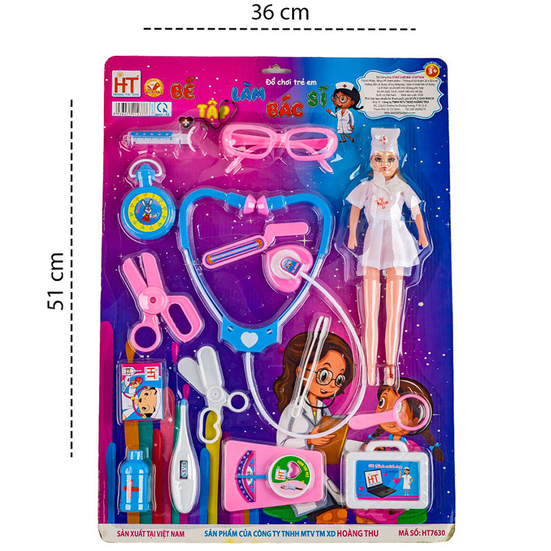 - Bộ sản phẩm bao gồm: Bộ sản phẩm bao gồm: ống nghe, kéo, nhiệt kế, búp bê, cân…(vui lòng xem thêm hình chi tiết sản phẩm)