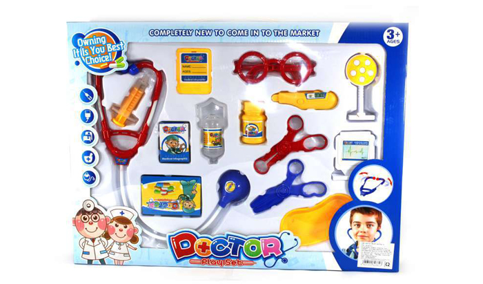 - Bộ đồ chơi bao gồm các dụng cụ thường dùng trong y tế như: ống nghe, mắt kính, ống tiêm, hộp thuốc...