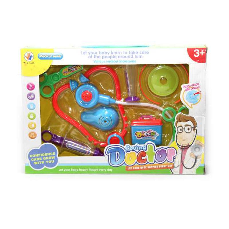 - Bộ đồ chơi bao gồm các dụng cụ thường dùng trong y tế như: ống nghe, mắt kính, ống tiêm, hộp thuốc...