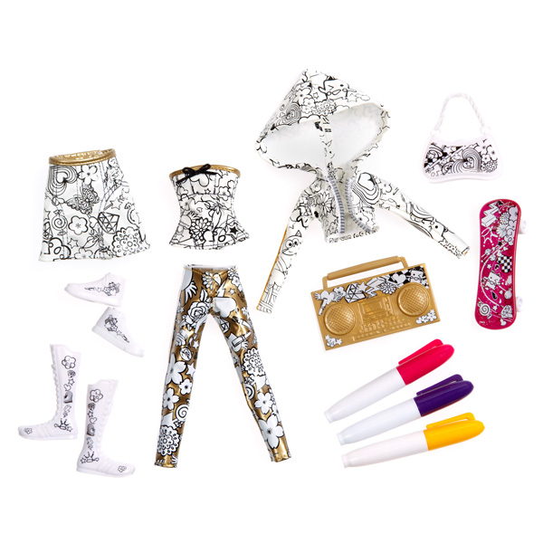 Bộ sản phẩm gồm: - Bộ sưu tập trang phục bằng da, màu trắng và màu đồng có hoa văn không màu để bạn tự do trang trí: 1 áo, 1 váy, 1 quần, 1 áo khoát. - 2 đôi giày: 1 đôi bốt, 1 đôi giày thể thao - Bộ phụ kiện: 1 máy nghe nhạc, 1 túi xách, 1 ván trượt - 3 bút lông màu trang trí.
