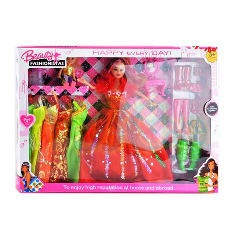 - Bộ sản phẩm gồm 1 búp bê nhựa và 10 bộ váy và giày khác nhau