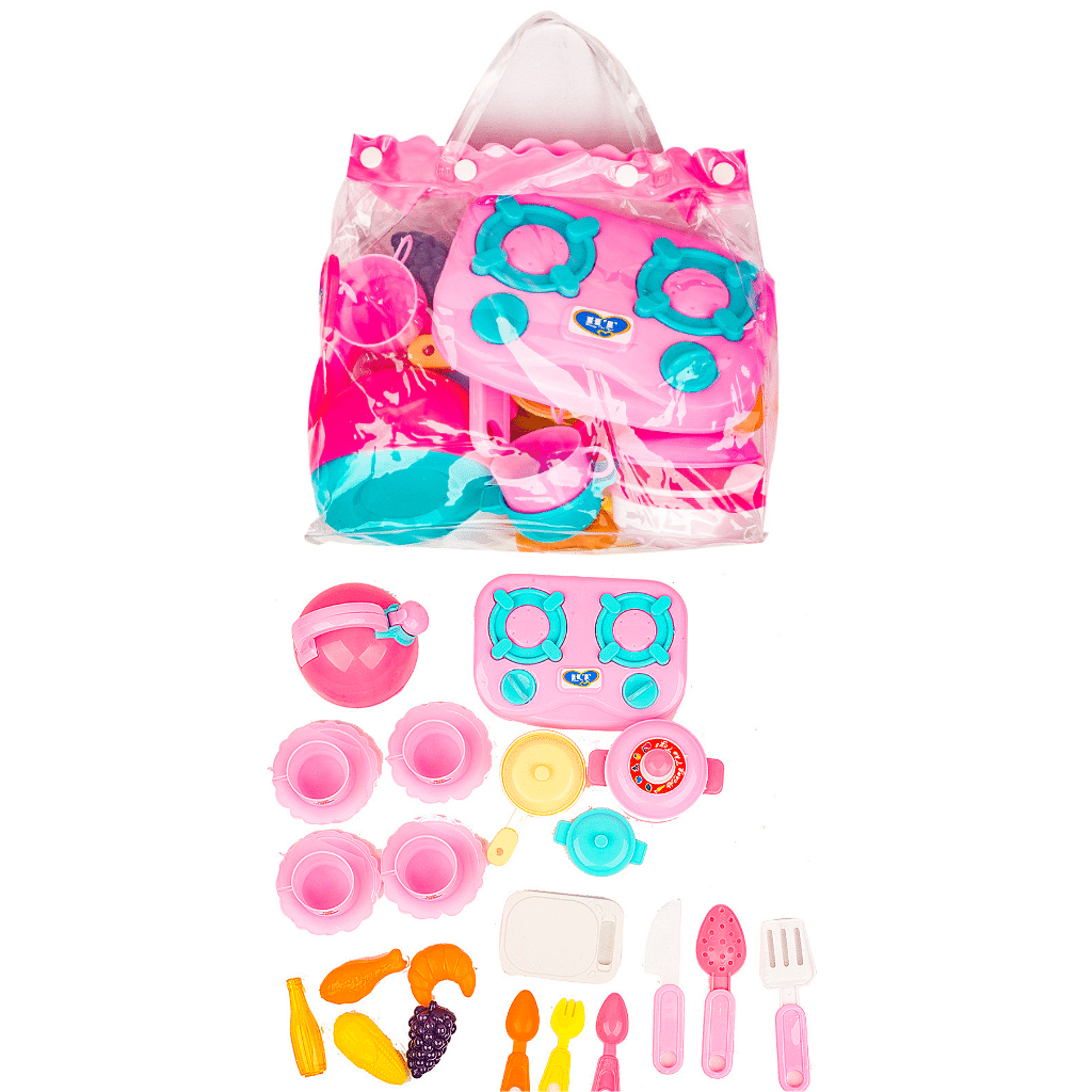 - Bộ đồ chơi mang đến rất nhiều các dụng cụ nhà bếp quen thuộc như nồi, chảo, đĩa, nĩa,… được thiết kế vô cùng đẹp mắt; kèm theo đó là nhiều loại thức ăn để bé chế biến hay bày biện khi vui chơi. Đồ dùng với màu sắc rực rỡ, sinh động, kích thích thị giác cho bé làm quen với nhiều màu sắc và hình ảnh mới lạ.