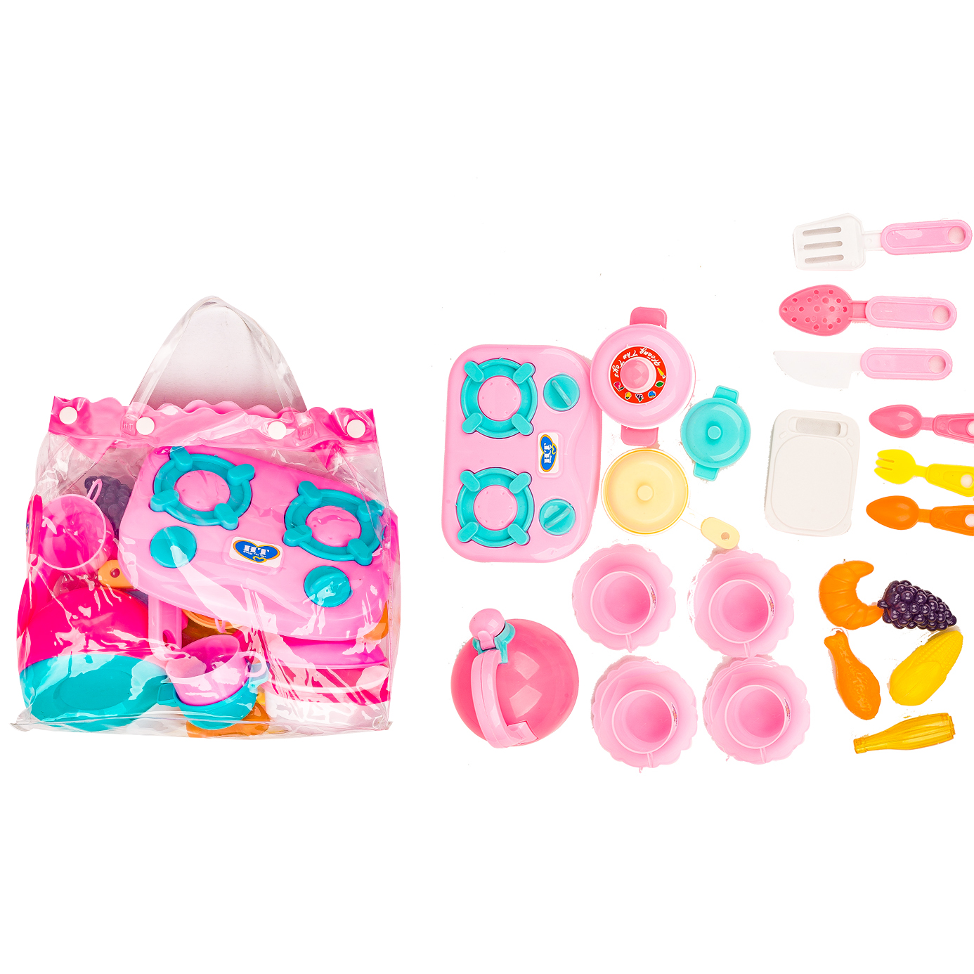 - Bộ đồ chơi mang đến rất nhiều các dụng cụ nhà bếp quen thuộc như nồi, chảo, đĩa, nĩa,… được thiết kế vô cùng đẹp mắt; kèm theo đó là nhiều loại thức ăn để bé chế biến hay bày biện khi vui chơi. Đồ dùng với màu sắc rực rỡ, sinh động, kích thích thị giác cho bé làm quen với nhiều màu sắc và hình ảnh mới lạ.