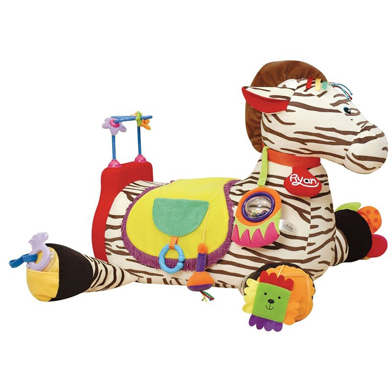 - Chú ngựa vằn Ryan bằng vải bông, đính nhiều miếng vải đầy màu sắc trên lưng, kèm những phụ kiện như đồ ngậm nướu, gương, xúc xắc, các hình dạng, các màu sắc, các họa tiết, bé có thể chạm và cảm nhận, có thể ôm được, có thể cưỡi lên lưng…