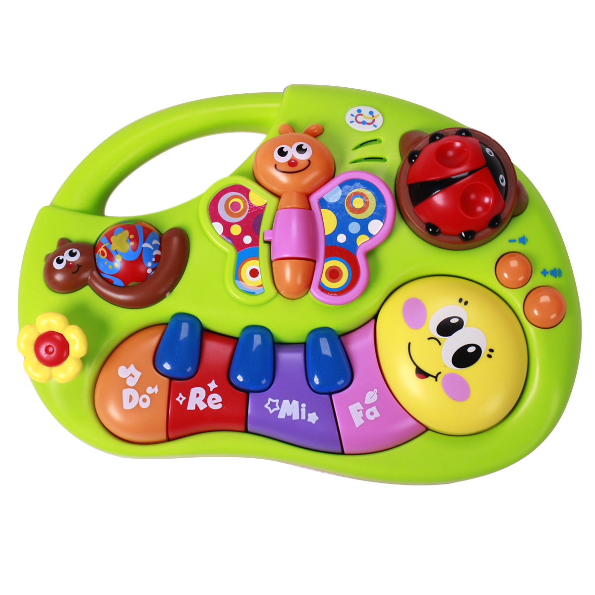 Chiếc đàn với hình chú sâu màu sắc, các núm bấm nhiều hình, cài sẵn các bản nhạc, giai điệu vui nhộn mang đến sự hào hứng cho bé khi hóa thân thành một nhạc công nhí dễ thương.