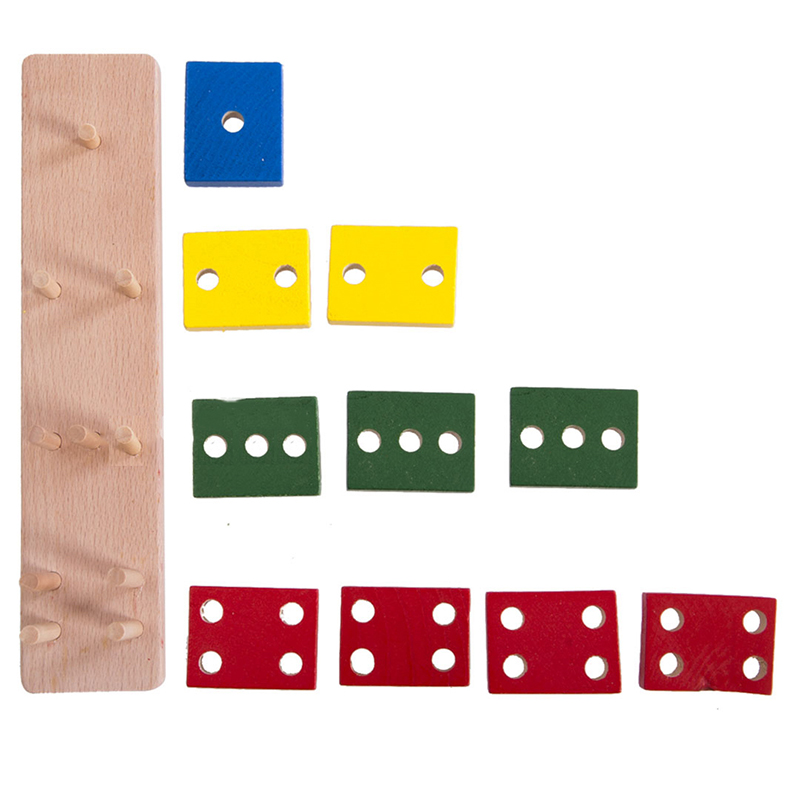 - Bộ sản phẩm các khối hình vuông có màu sắc khác nhau giúp bé tập nhận diện các hình và xếp chúng vào các cọc tiêu.