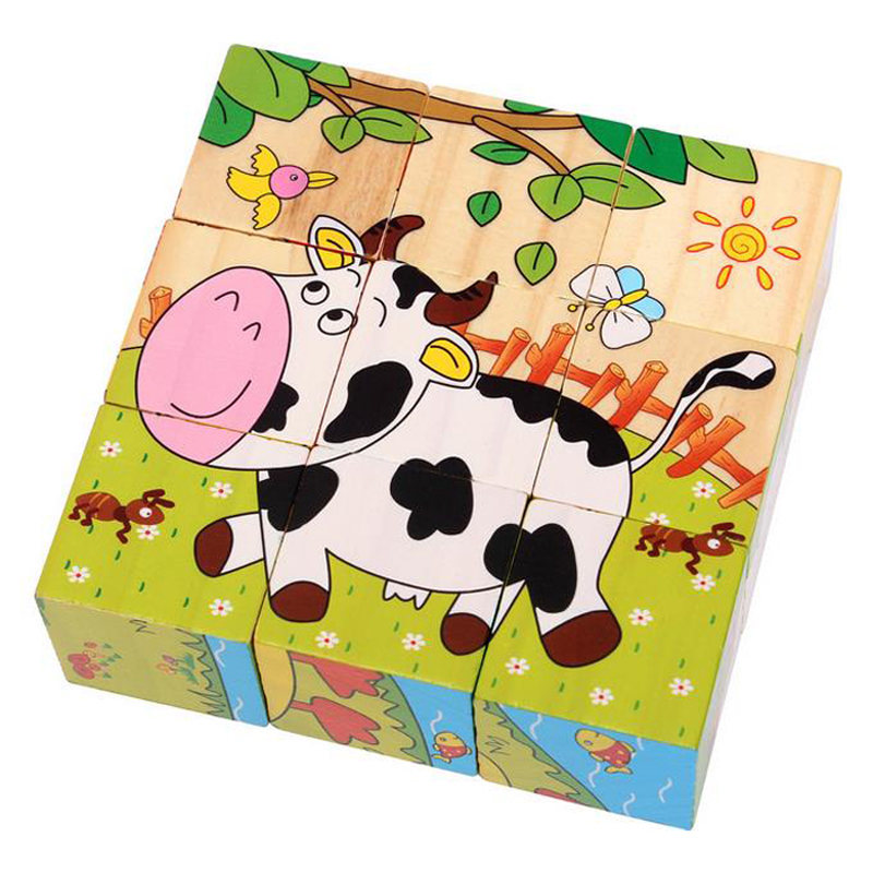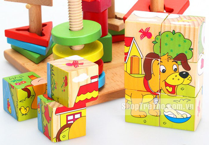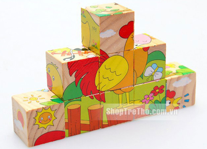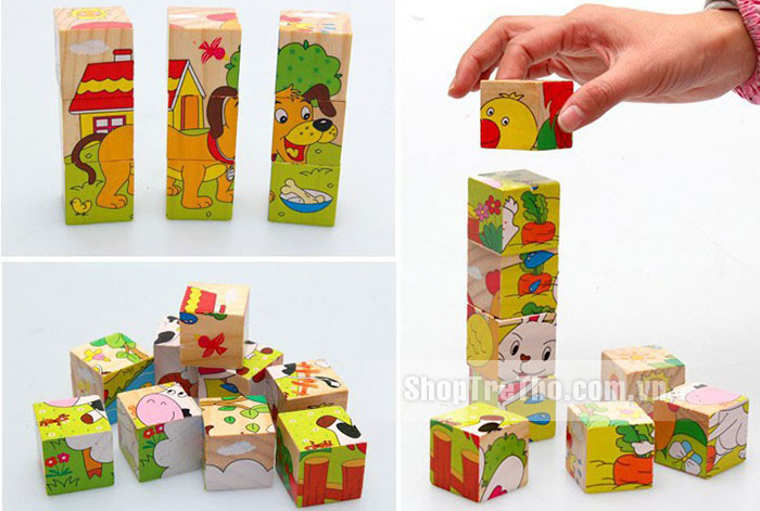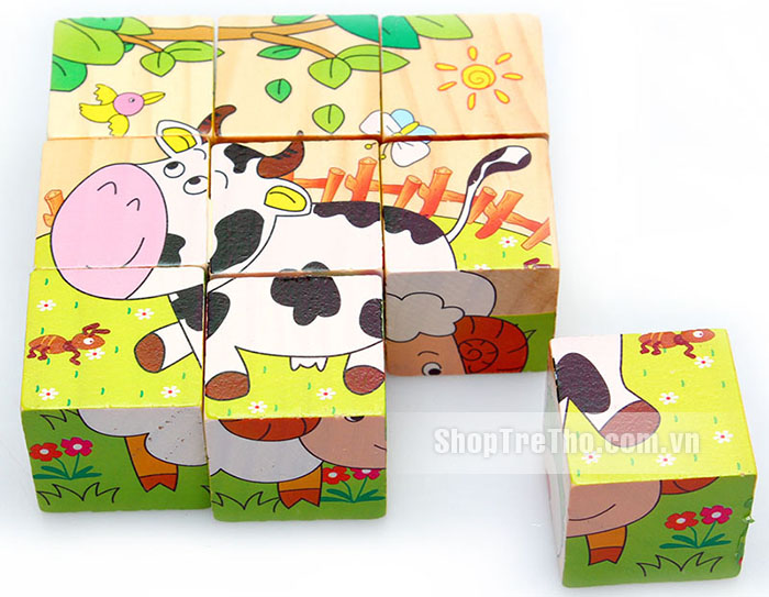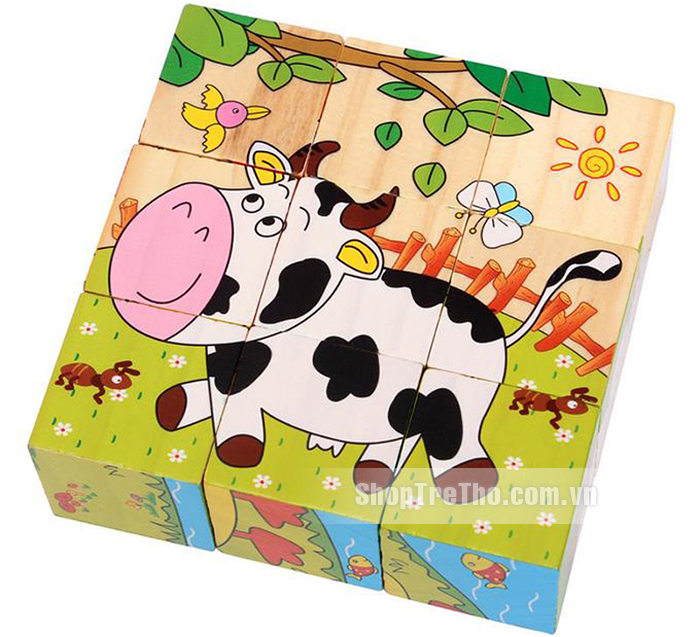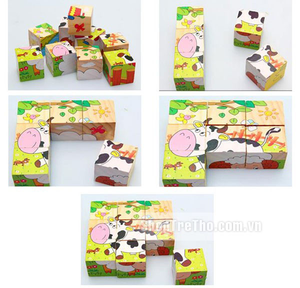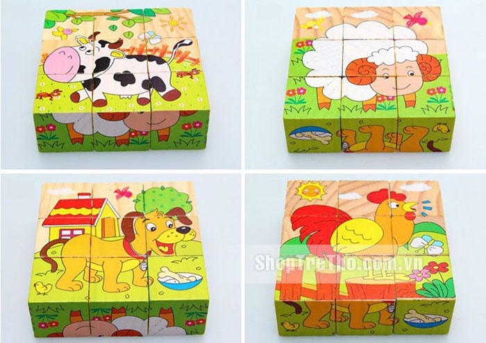 - Bộ đồ chơi dạng ghép hình khối 6 mặt có thể ghép được 6 hình con vật khác nhau theo mẫu, những hình ảnh này được in trực tiếp trên sản phẩm