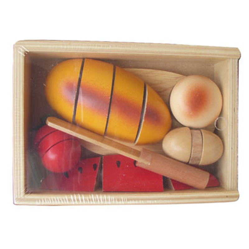 - Bộ sản phẩm gồm mô hình các loại bánh và trứng với màu sắc và trang trí đẹp mắt đi kèm với dao và đĩa gỗ.