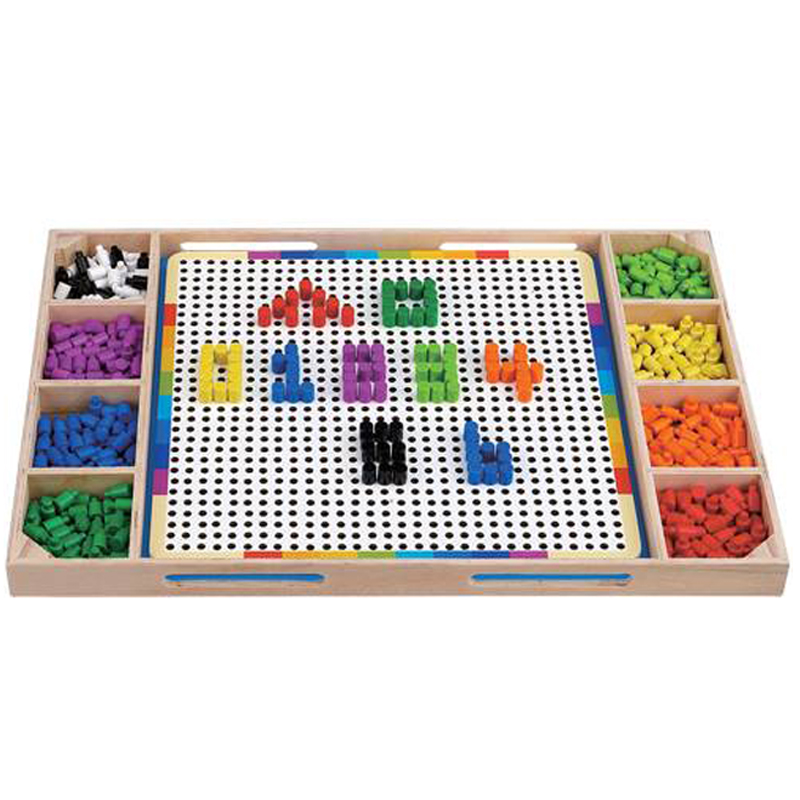 - Khay gỗ chứa nhiều nút gỗ nhỏ nhiều màu và 01 bảng gắn nút xếp hình kết hợp với trò chơi cá ngựa.