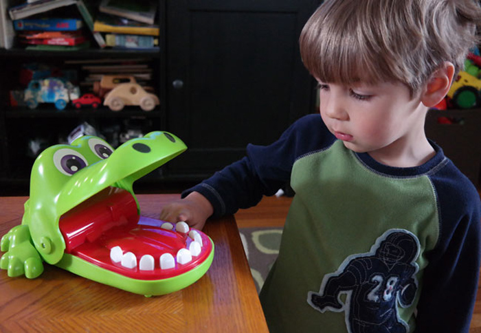 - Bé và các bạn sẽ đóng vai làm "nha sĩ", khám răng cho cá sấu, mỗi người đụng vào 1 chiếc răng, nếu ai đụng phải chiếc răng sâu (có thể ấn xuống), thì cá sấu sẽ đóng miệng lại và người đó thua cuộc.