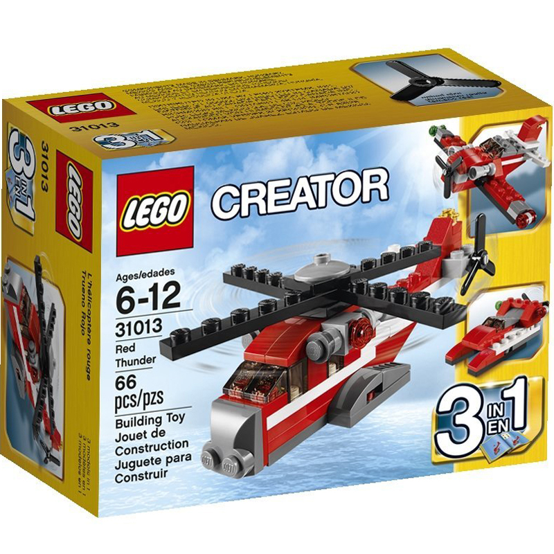 Điều khiển chiếc máy bay trực thăng mạnh mẽ 3-trong-1 để cứu hộ khẩn cấp! Chiếc máy bay trực thăng vận tải Red Thunder rất thích hợp để chuyển hàng cứu trợ tới những vùng núi xa xôi. Với màu đỏ nổi bật và động cơ mạnh mẽ, chiếc máy bay này cũng rất phù hợp để sử dụng làm máy bay cứu hộ. Tuyệt vời hơn nữa là bạn có thể lắp nó lại thành một chiếc máy bay 2 tầng cánh hoặc một chiếc tàu siêu tốc mạnh mẽ. Shoptretho.com.vn xin giới thiệu bộ xếp hình đồ chơi LEGO Creator 31013- máy bay thần sấm siêu tốc