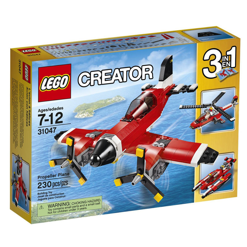 Đồ chơi Lego Creator 31047 - Máy bay cánh quạt được làm từ chất liệu nhựa nguyên sinh, với 230 mảnh ghép, bé có thể thỏa sức sáng tạo nên 3 mô hình khác nhau: máy bay cánh quạt, thủy phi cơ công nghệ cao hay chiếc máy bay trực thăng mạnh mẽ. Đồ chơi dành cho các bé từ 7 - 12 tuổi.