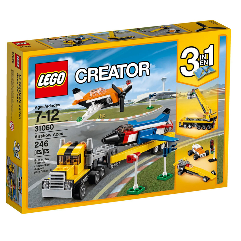 Đồ chơi Lego Creator 31060 gồm 246 miếng ghép để bé có thể ráp thành 1 trong 3 mô hình lắp ghép khác nhau: máy bay phản lực, máy bay cánh quạt và một xe tải vận chuyển bằng xe kéo có thể kéo rời. Các mô hình có thiết kế đặc biệt: xe tải có thể tháo rời, xe trailer dài màu vàng, xám, đen và máy bay phản lực có buồn lái màu xanh, trắng đỏ, máy bay cánh quạt có thêm cánh quạt quay màu cam.