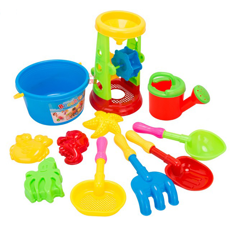 Bộ sản phẩm gồm nhiều món đồ chơi : xô, xẻng, rây cát, khuôn tạo hình...