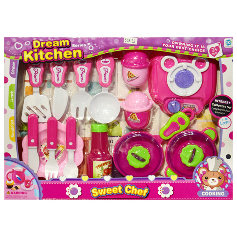 Đồ chơi nhà bếp Dream kitchen 558-32 sẽ là món quà được các bé gái mong đợi nhận được từ bố mẹ, người thân. Bộ sản phẩm gồm nĩa, thìa, chảo, dao, nồi nấu...được làm từ nhựa cao cấp, bé có thể hóa thân thành người đầu bếp tài ba, chơi nhiều trò thú vị cùng các bạn.