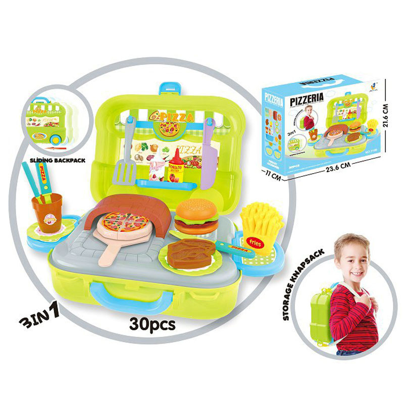 Đồ chơi nhà bếp quầy bán pizza VBC-3106 gồm 30 chi tiết mô phỏng lại cửa hàng bán pizza, bánh kẹp, khoai tây chiên...để bé có thể đóng vai là người bán Pizza chuyên nghiệp phục vụ cho khách hàng. Đặc biệt, tất cả các chi tiết được đựng trong vali, bé dễ dàng cất gọn và kéo theo khi đi chơi xa.