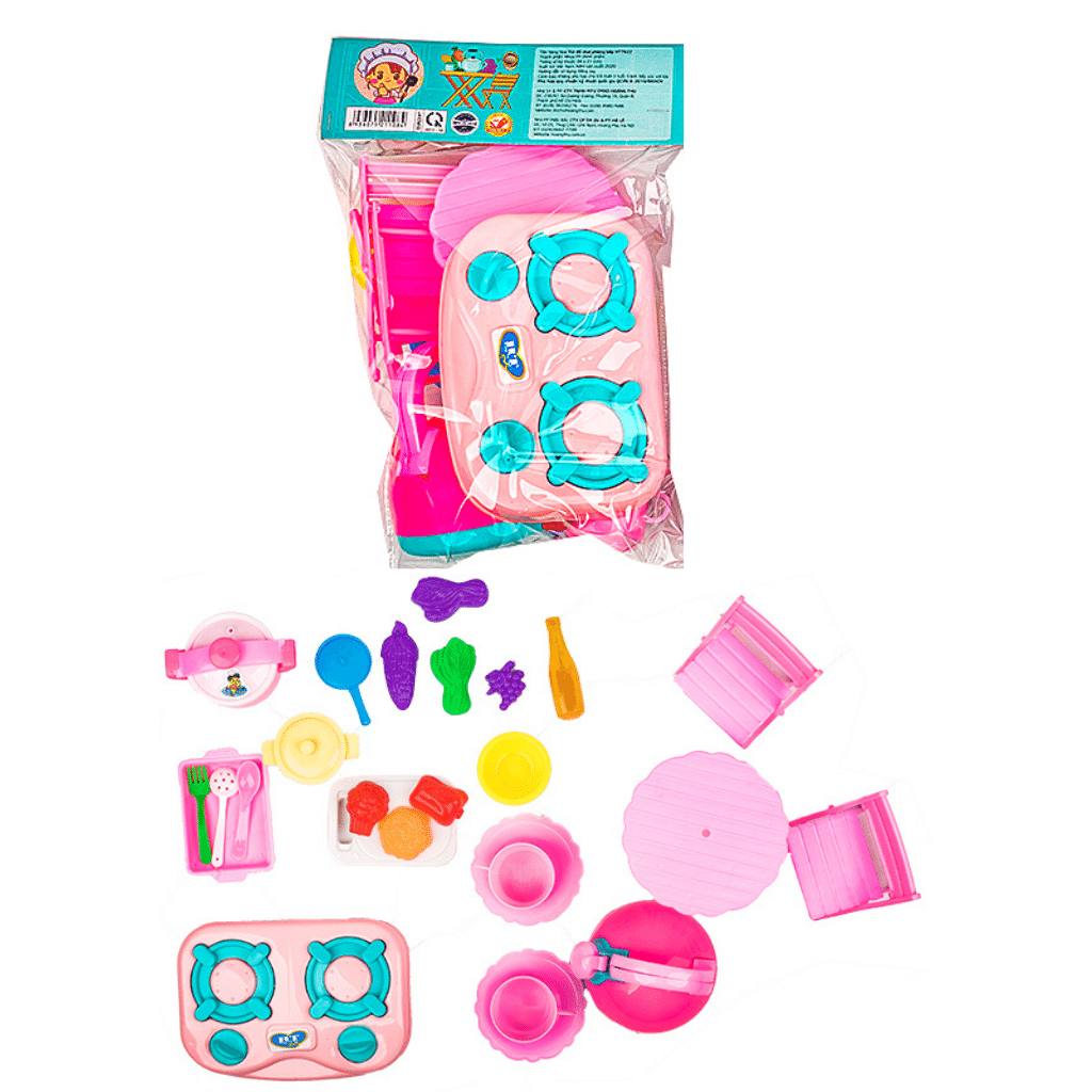 - Bộ đồ chơi mang đến rất nhiều các dụng cụ nhà bếp quen thuộc như nồi, chảo, đĩa, nĩa,… được thiết kế vô cùng đẹp mắt; kèm theo đó là nhiều loại thức ăn để bé chế biến hay bày biện khi vui chơi. Đồ dùng với màu sắc rực rỡ, sinh động, kích thích thị giác cho bé làm quen với nhiều màu sắc và hình ảnh mới lạ.