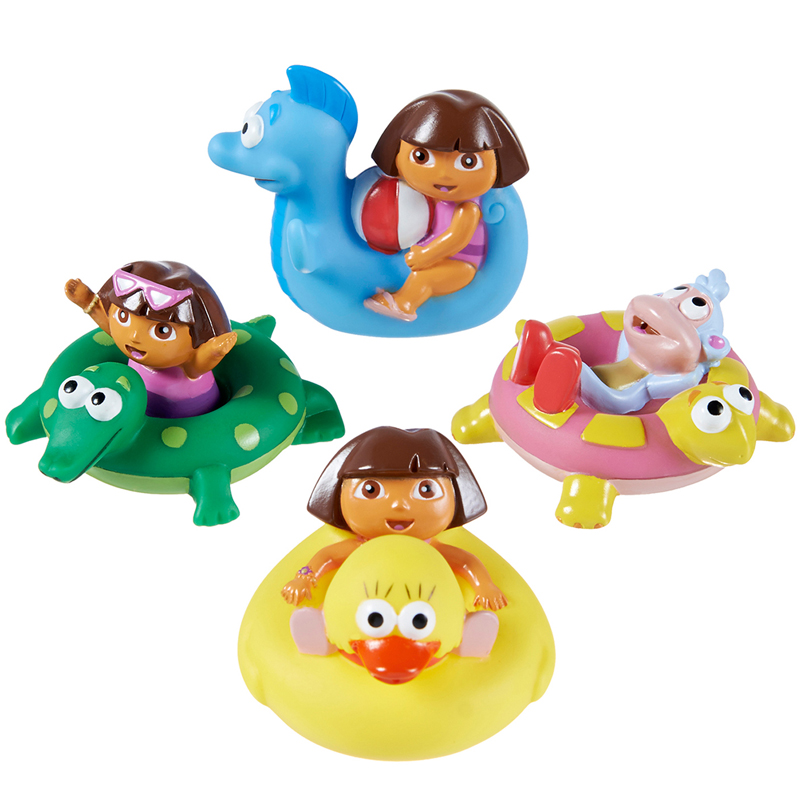 Bộ đồ chơi phun nước hình Dora gồm 4 sản phẩm cô bé Dora cưỡi trên các con vật khác nhau. Bé có thể học số, học màu sắc và đặc điểm của từng con vật mà Dora cỡi.