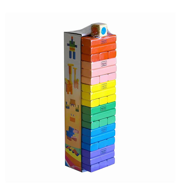 - Bộ đồ chơi có xúc xắc đi kèm, để tăng độ khó cho mọi người. Khi chơi rút gỗ, ai tung được xúc xắc màu nào chỉ được rút gỗ màu đó.