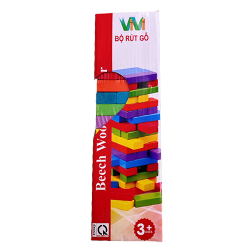 - Đồ chơi rút thanh gỗ mộc Vivitoys 364 gồm 48 thanh gỗ có hình dạng giống như viên gạch nhỏ, sơn nhiều màu sắc xanh, đỏ, vàng, cam… và kèm theo 2 viên xí ngầu nhỏ có 6 mặt dùng để xác định lượt chơi.