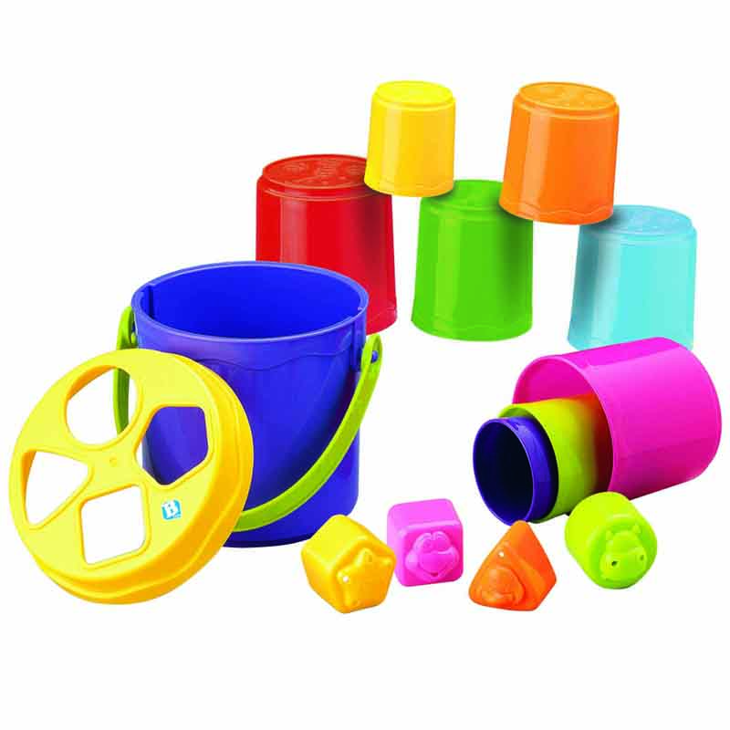 + Với chiếc xô, bé có thể chơi thả hình khối vào, đặc biệt các khối thả hình có lỗ để chảy nước nên bé có thể mang theo để chơi khi tắm hoặc đi biển