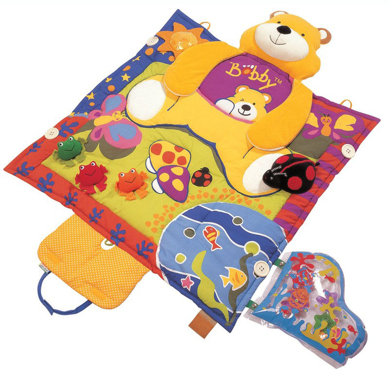 Bé tha hồ chơi, trườn bò trên thảm vận động. Bao gồm: 1 chú cánh cam có gương, 3 chú ếch nhỏ có xúc xắc và kèn, và một túi nước có thể tháo rời để làm một hồ cá nhỏ cho bé sờ và cảm nhận.