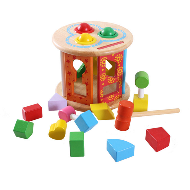 - Bên mặt trên khối hình trụ có 3 lỗ hổng hình tròn dùng để đặt các quả bóng nhỏ. Các khối hình rời bao gồm các hình cơ bản: hình vuông, hình chữ nhật, hình tam giác, hình thoi, hình thang… 3 quả bóng nhỏ màu xanh lá cây, màu đỏ, màu vàng. 1 búa gỗ dùng để đập bóng.