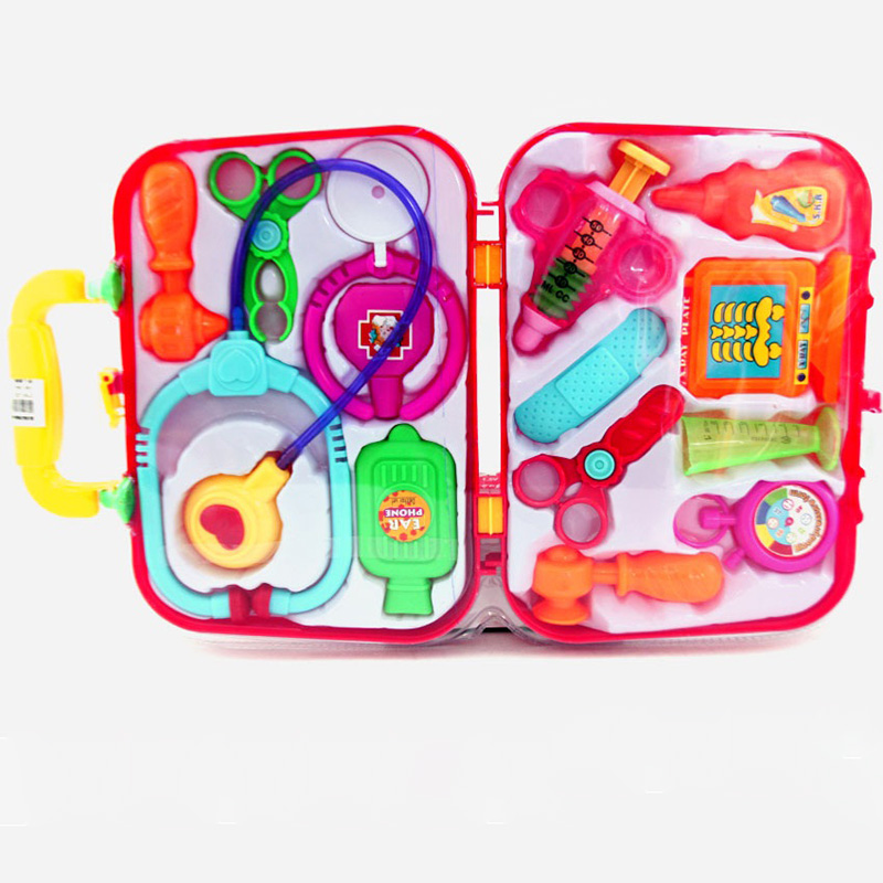 - Va li đồ chơi làm bác sĩ 10 món bao gồm: 1 va li trắng, 9 món đồ cho bé tập khám bệnh gồm 1 ống nghe chạy pin thể hiện nhịp tim và sáng đèn, 1 đèn nội soi tai mũi họng có đèn, 1 cặp sốt chạy pin báo nhiệt độ và sáng đèn, 1 dụng cụ kiểm tra phản xạ, 1 kéo, 1 kim tiêm có lò xo, lọ thuốc, 1 bảng tên