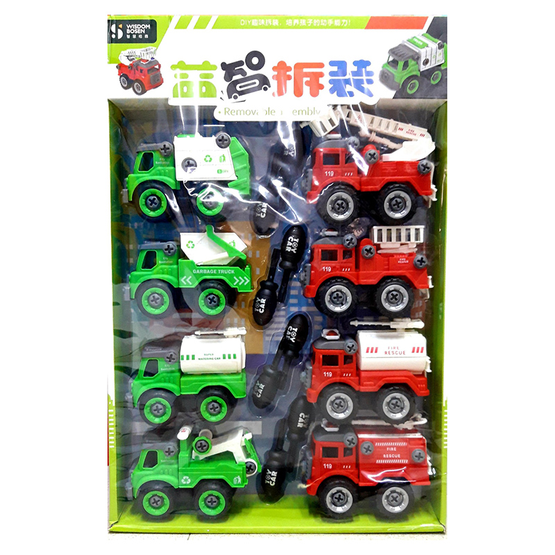- Thiết kế gồm các loại xe: công trình, cứu hỏa... đi kèm với tua vít để bé có thể chơi trò tháo lắp, sửa chữa dễ dàng