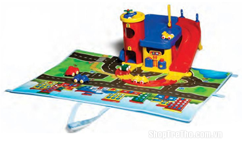Đồ chơi Viking Toys - Trạm xe và bản đồ gồm: Hai tầng nhà để xe với thang máy, hàng rào, trạm xăng, đi kèm với 2 xe và 1 trực thăng.