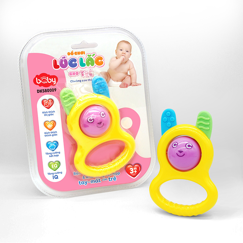 - Thiết kế hình thỏ con, 2 tai có gân sần, đầu thỏ có chứa các viên xúc xắc tạo ra âm thanh