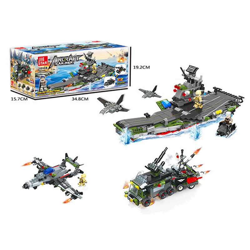 Đồ chơi xếp hình Jie Star 20108 - Tàu thủy chiến gồm 102 chi tiết bằng nhựa PP, ABS để bé ráp thành chiếc tàu chiến sân bay chạy trên biển, có thể mang theo máy bay chiến, xe quân sự, tàu thủy có vũ khí... Thông qua việc lắp ghép, bé sẽ học được tính kiên trì, phát triển tư duy và xây dựng các câu chuyện cho riêng mình.