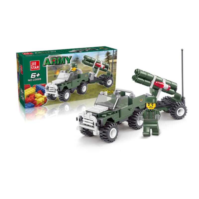 Đồ chơi xếp hình Jie Star 23009 - Xe quân sự gồm 104 chi tiết bằng nhựa PP, ABS để bé ráp thành chiếc xe pháo, cùng 1 chú bộ độ bên cạnh. Bé có thể chơi trò đánh trận giả, hay tập luyện quân sự cùng bạn bè, từ đó phát triển khả năng giao tiếp cũng như tăng trí tưởng tượng, tự viết ra những câu chuyện cho mình.