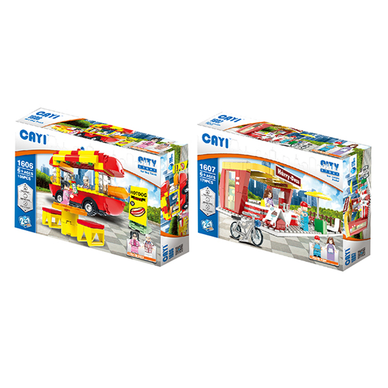 - Từ các mảnh ghép nhiều màu sắc, bé sẽ ráp thành các mô hình cửa hàng bán đồ ăn, cafe, nhà cửa, trung tâm mua sắm...đặc trưng của đô thị