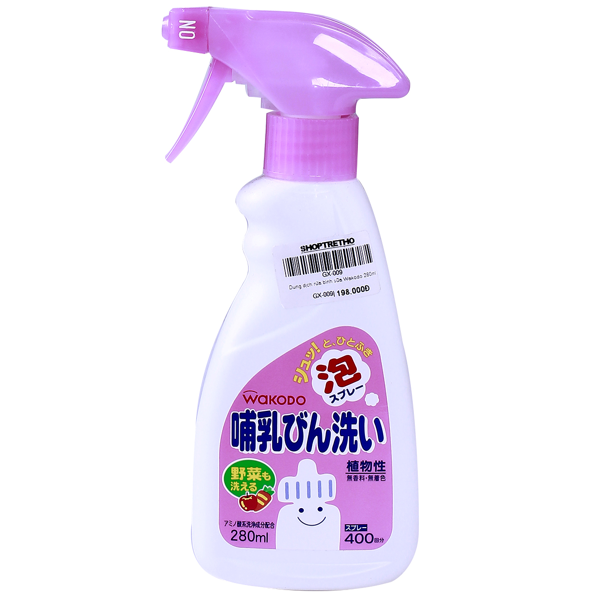 Dung Dịch Rửa Bình Sữa Wakodo 280 ml dùng để rửa bình sữa, núm ty, rau, quả, đồ chơi cho trẻ em và dụng cụ ăn uống. Làm sạch mọi vết bẩn của bình sữa như cặn mỡ, protein, an toàn không làm hại da tay, sản phẩm chính hãng Wakodo nhập khẩu từ Nhật Bản.