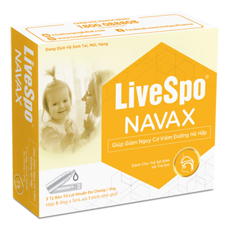 Dung dịch vệ sinh tai, mũi, họng trẻ em LiveSpo NAVAX (5 ống x 5ml) là dung dịch nước muối sinh lý chứa bào tử lợi khuẩn vệ sinh tai mũi họng cho trẻ sơ sinh và trẻ em. Đây là một trong những sản phẩm ứng dụng công nghệ bào tử lợi khuẩn Dr. ANH trong phòng ngừa và xử lý các vấn đề viêm đường hô hấp cấp tính.