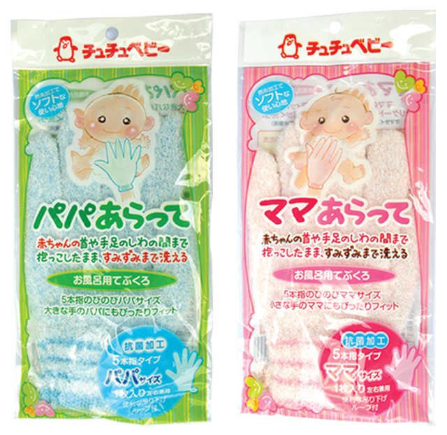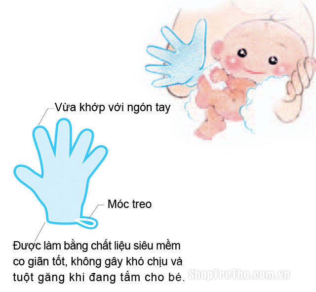 Nhằm mang lại sự thuận tiện cho mẹ khi tắm em bé, sản phẩm găng tay tắm được thiết kế theo hình dáng bàn tay, dễ dàng cọ rửa những chỗ ngấn cổ, khớp tay chân mà không làm đau bé. Sản phẩm được dệt từ sợi dệt có khả năng kháng khuẩn, có khả năng hong khô dễ dàng như quần áo.