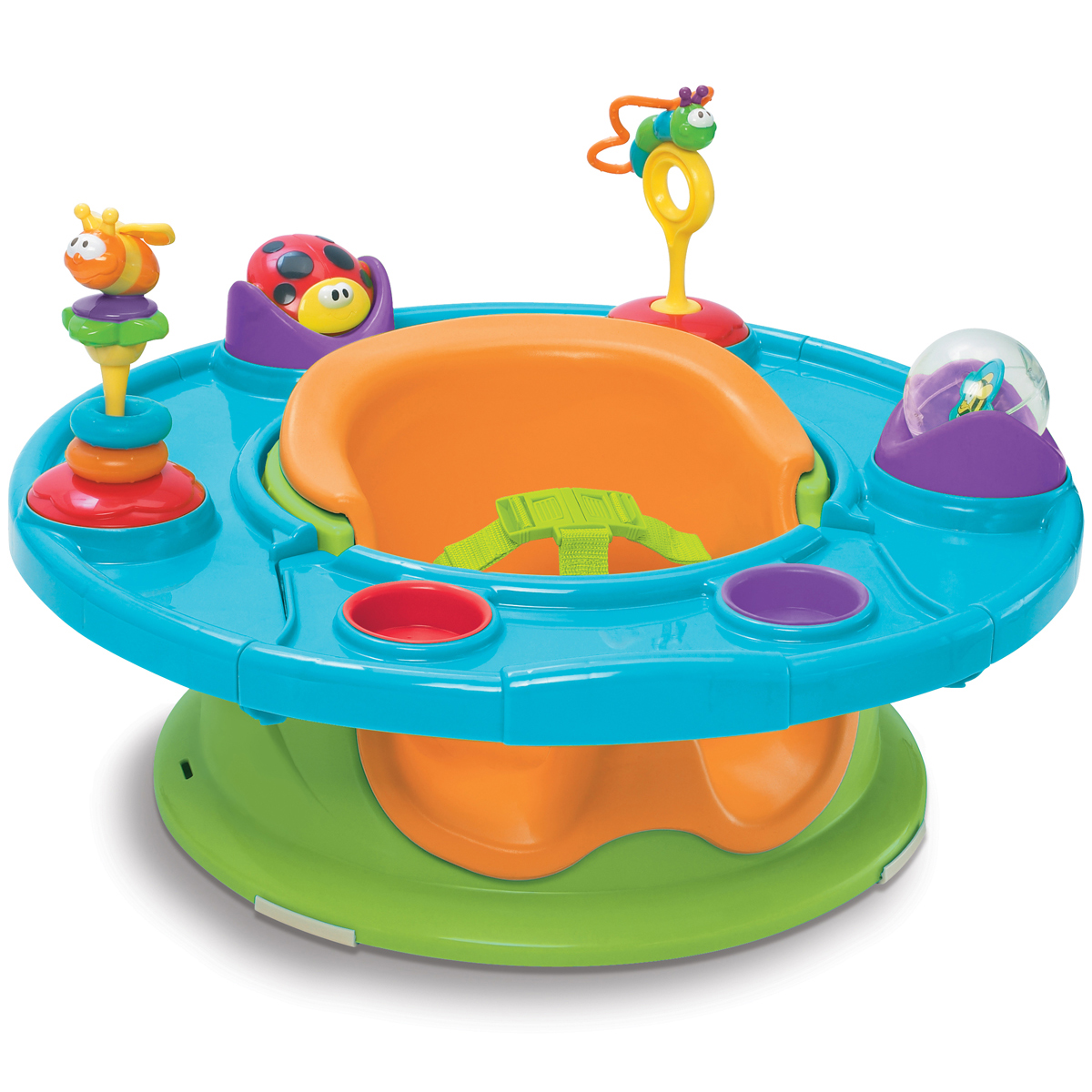 Khi bé bắt đầu tập ăn. Bố mẹ lắp thêm một chiếc khay ăn có thể quay 360 độ giúp bé có chỗ ngồi ăn tiện lợi và vui vẻ. Xung quanh khay có 6 đồ chơi bằng nhựa tạo âm thanh vui nhộn khi xoay khay ăn. Trên khay có 2 chỗ để cốc, mẹ có thể đặt đồ ăn khô vào đó để bé tự tập ăn.