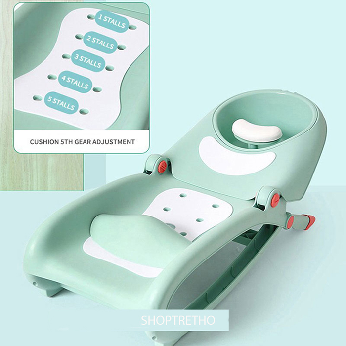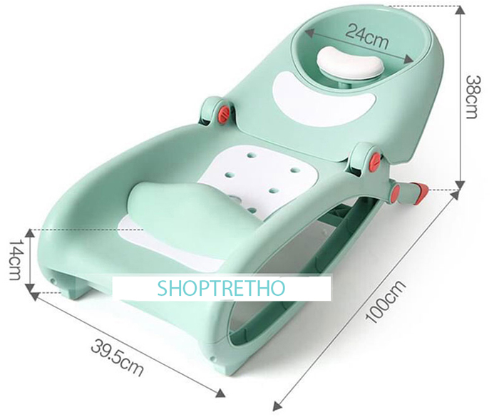 - Phần trên cùng được thiết kế thêm đệm đỡ đầu và chậu gội tiện lợi: Ghế có đệm đỡ đầu bằng mút xốp bọc da giúp bé nằm êm ái hơn, chậu chứa nước khá to điều này giúp cho nước không bị nước không bị bắn ra ngoài khi mẹ gội đầu cho bé.