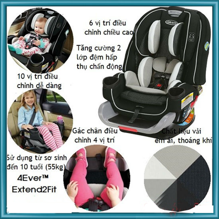 - Ghế ngồi ô tô Graco 4Ever Extend2Fit có thể sử dụng cho bé sơ sinh đến 10 tuổi nên bố mẹ không lo tốn thêm tiền mua ghế mới khi trẻ lớn hơn.