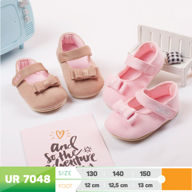 Giày tập đi đế kết Uala - UR7048 với thiết kế kiểu búp bê, có đính nơ tăng thêm nét điệu đà cho bé gái. Sản phẩm được may từ vải mềm, đế bằng cao su non, giúp bé tự tin bước đi đồng thời giữ âm cho đôi chân của bé yêu.