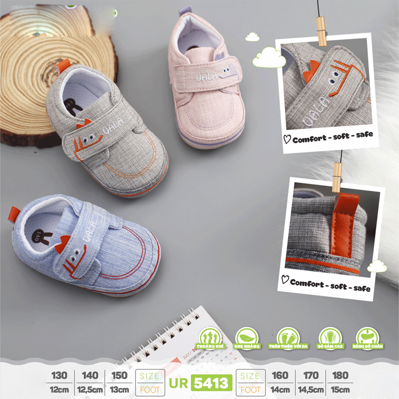 Giày tập đi Uala Rogo UR5413 may từ chất liệu vải mềm và đế được làm từ cao su non an toàn tuyệt đối cho bé do không sử dụng hóa chất trong quá trình sản xuất. Sản phẩm được may chắc chắn, mềm mại, không ảnh hưởng tới sự phát triển của bàn chân bé.