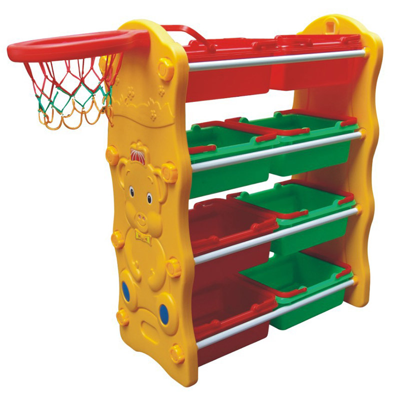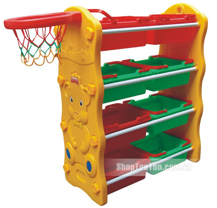 - Giá có 4 tầng, mỗi tầng có 2 khay nhựa đựng đồ, bố mẹ có thể hướng dẫn bé để từng món đồ chơi theo từng ngăn.