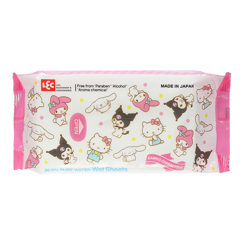Giấy ướt LEC Sanrio E90384 (80 tờ) làm từ vải tơ nhân tạo mềm mịn và có kích thước 180 x 150mm, thích hợp sử dụng để vệ sinh cho bé hàng ngày khi ăn uống, thay tã hoặc dùng để lau mồ hôi nhằm ngăn ngừa các hiện tượng phát ban, dị ứng do bụi hoặc do đóng bỉm lâu.