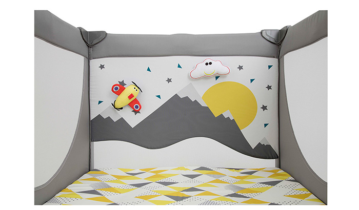 - Để tăng thêm phần thích thú cho trẻ, mặt trong của cũi được trang trí khung cảnh thiên nhiên ngộ nghĩnh đi kèm 2 thú bông mềm mại. Không gian màu sắc giúp tăng sự kích thích phát triển não bộ và thị giác của trẻ.