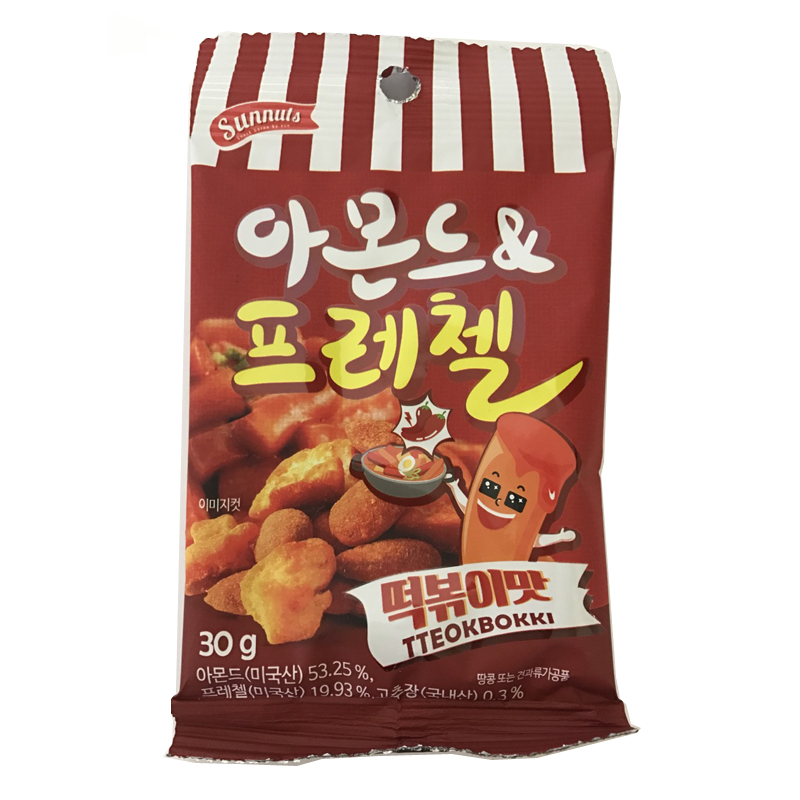 - Thàn phần: Hạnh nhân nguyên chất, có kèm bánh vị Tteokbokki cay