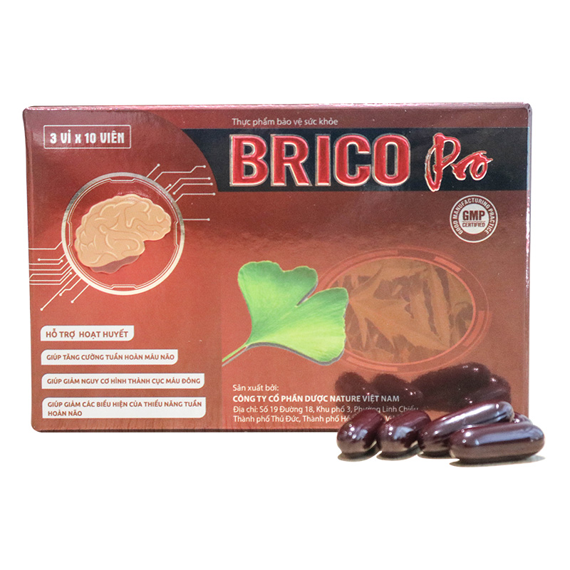 Hoạt huyết dưỡng não Brico Pro được chiết xuất từ cao rễ Đinh Lăng và cao lá Bạch Quả, đậu tương,... có tác dụng hỗ trợ hoạt huyết, tăng cường tuần hoàn máu não, giảm nguy cơ hình thành cục máu đông, giúp giảm biểu hiện của thiểu năng tuần hoàn não.