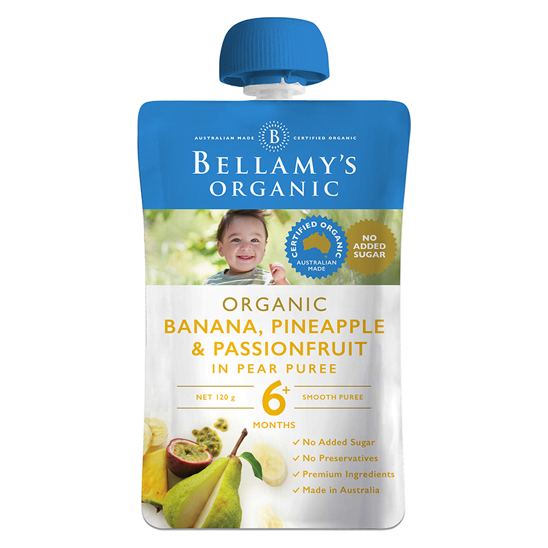 Hỗn hợp ăn dặm lê, chuối, dứa, chanh dây Bellamy's Organic (120g) cung cấp 100% thành phần trái cây hữu cơ giúp kích thích vị giác của bé với vị thơm ngọt tự nhiên của bốn loại trái cây kết hợp trong một túi tiện lợi, không chất bảo quản và phụ gia nhân tạo.