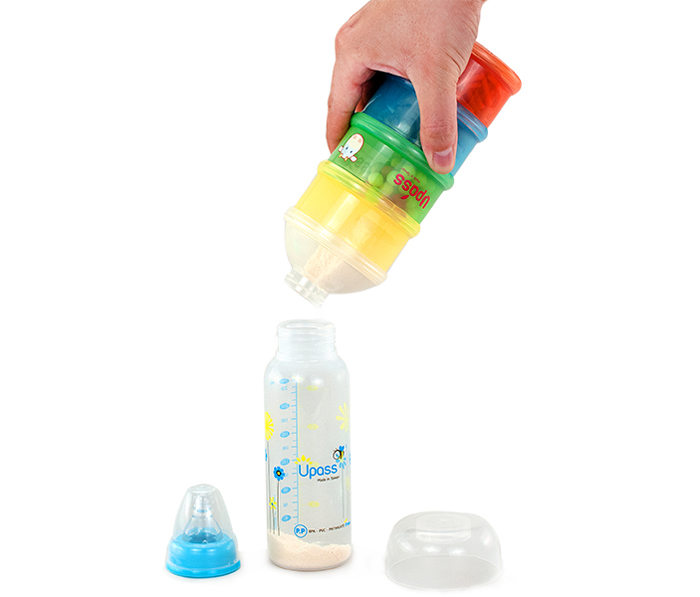 Hộp đựng sữa UPASS cho phép đổ sữa trực tiếp vào bình sữa với lượng bột được đong sẵn nhờ thiết kế cổ bình và nắp đậy